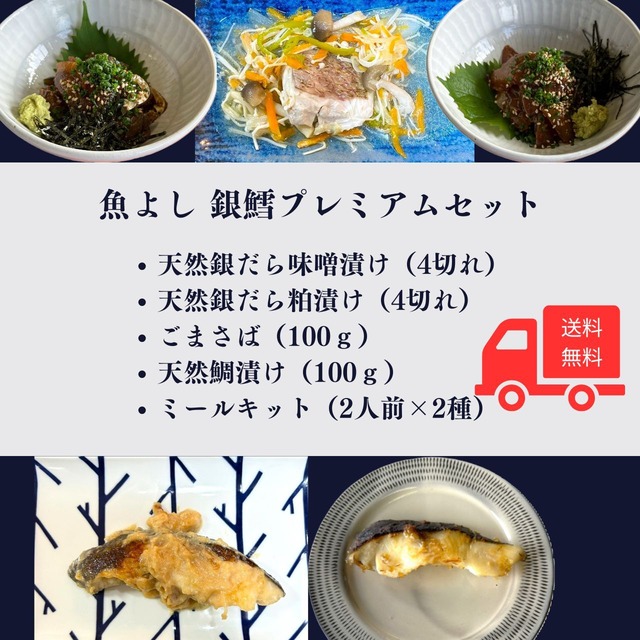 脂のりの良い銀鱈を、魚よしが目利きし、 特製の無添加味噌だれ・酒粕だれで丁寧に漬け込んだ「銀鱈」を主役にした、贅沢なセットです。 とろけるような食感と、焼き上げた際に広がる芳醇な香り。 魚よし自慢の銀鱈を存分にお楽しみいただけます。 さらに本セットには、 魚よしの人気商品である ・九州産 胡麻サバ ・天然鯛の漬け刺身 ・湯せん調理で手軽に楽しめるミールキット も詰め合わせました。 焼き魚、刺身、ご飯ものまで揃った内容で、 ご家庭でのごちそうはもちろん、贈り物としても満足度の高いセットです。 魚屋・魚よしが自信をもってお届けする、 特別なひとときをぜひご堪能ください。 ※冷凍でお届けいたします。