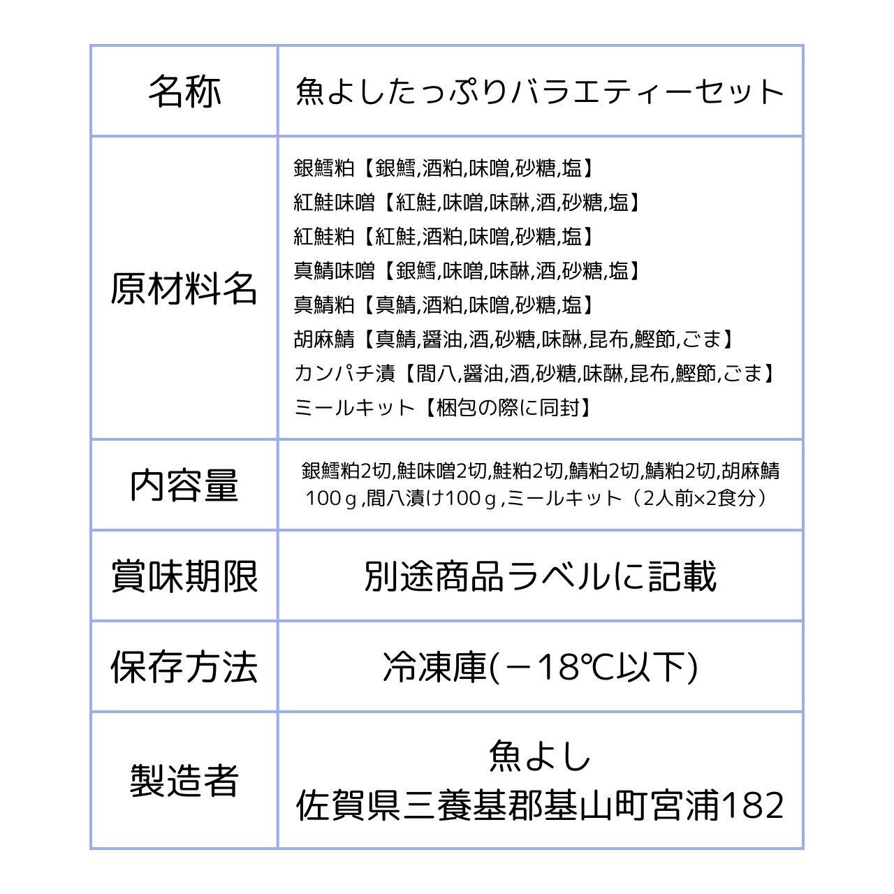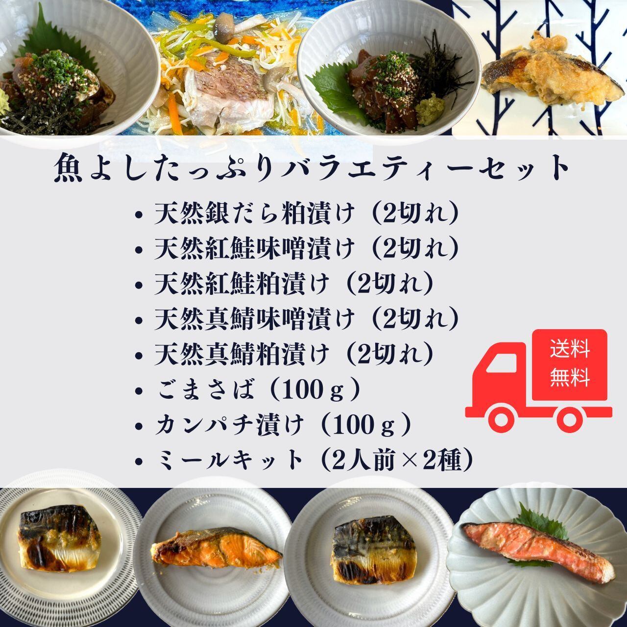 銀鱈・鮭・さばの粕漬・味噌漬に、ごまさばとカンパチの漬け刺身、さらにミールキット2種を組み合わせた、いちばんバラエティ豊かな詰め合わせです。